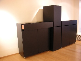 Kubus mit Schublade für Pulli und Unterwäsche: Dieser Kubus ist nur 42 cm tief und 120 cm hoch. Somit hat man genauso viel Platz, wie zusammengelegte Pullis benötigen. Zuoberst befindet sich eine Schublade, in der Socken und Unterwäsche gut sichtbar versorgt werden können.