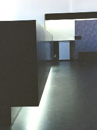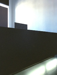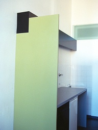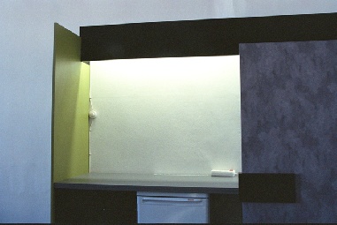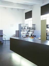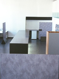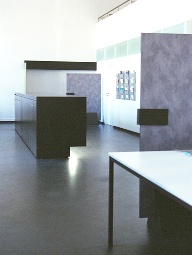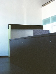 Herzstück der neuen Räumlichkeit ist der vielseitig nutzbare, großzügig dimensionierte Kommunikationskorpus. Er teilt den Raum in einen Arbeits- und Eingangsbereich, zieht als Empfangstheke und Kommunikationsplattform Leute an und animiert zum Austausch. Abends überrascht er durch Schwerelosigkeit. Formale Ergänzung und Gegengewicht dazu bilden die körperhaften farbigen Panele. Ihr Rhythmus vermittelt Freude und Klarheit, was den kommunikativen Charakter des Raumes zusätzlich unterstreicht.